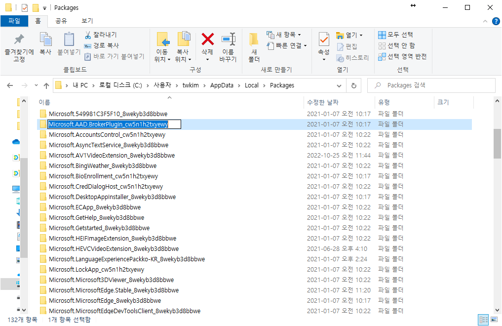 - 해당 폴더의 이름을 Microsoft.AAD.BrokerPlugin_cw5n1h2txyewy.old로 변경합니다.