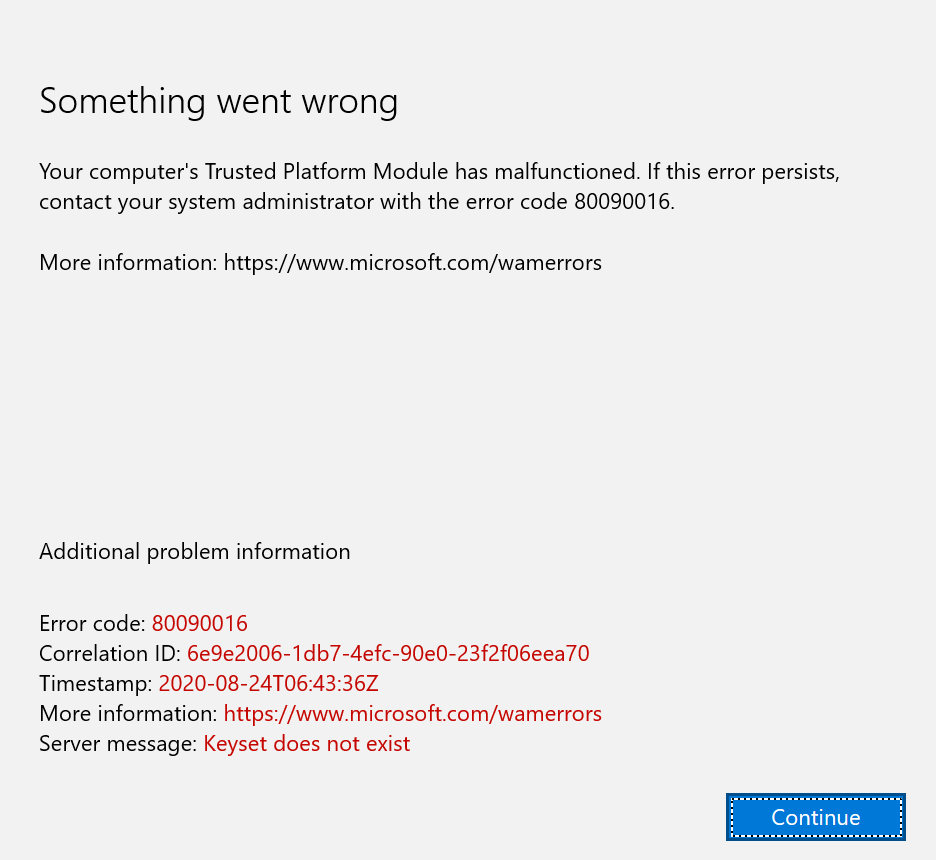 컴퓨터의 신뢰할 수 있는 플랫폼 모듈이 작동하지 않습니다. 이 오류가 계속되면 시스템 관리자에게 이 오류 코드 80090016을 알려주세요."