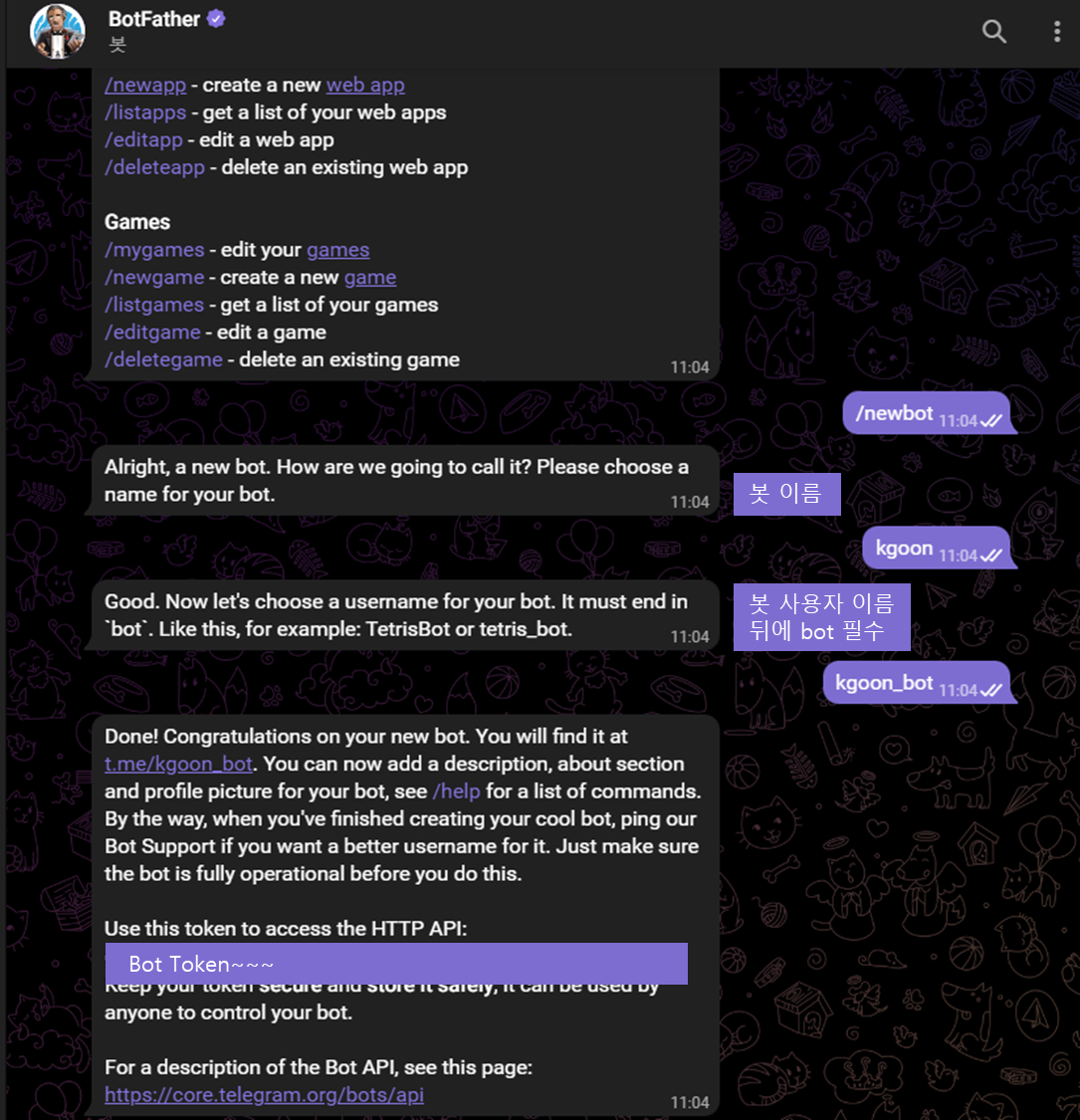 3. 봇의 이름과 사용자 이름을 입력하면, 봇이 생성됩니다. 여기서 봇의 사용자 이름은 반드시 'bot'으로 끝나야 합니다.