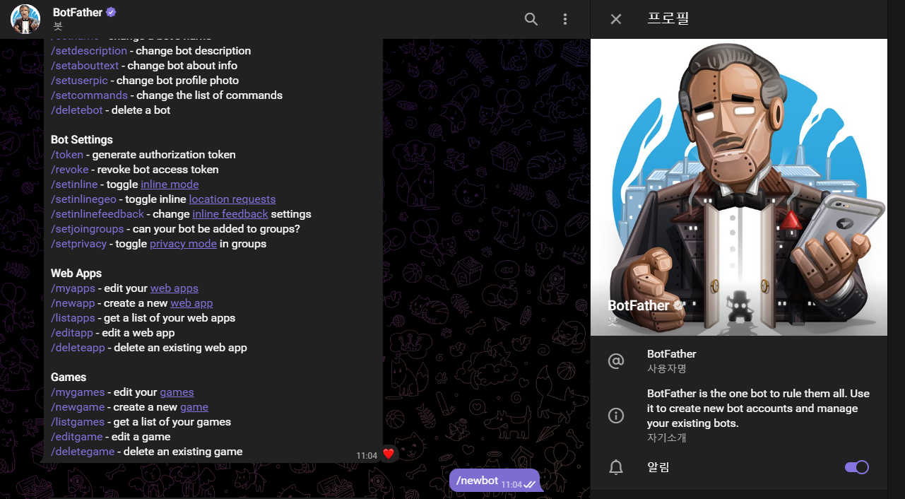 1. 텔레그램에서 @BotFather를 검색해 대화창을 엽니다.