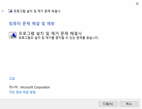프로그램 설치 및 제거 문제 해결사를 다운 받아 실행합니다. (위 링크로 들어가서 다운 받으신 후 실행하세요)